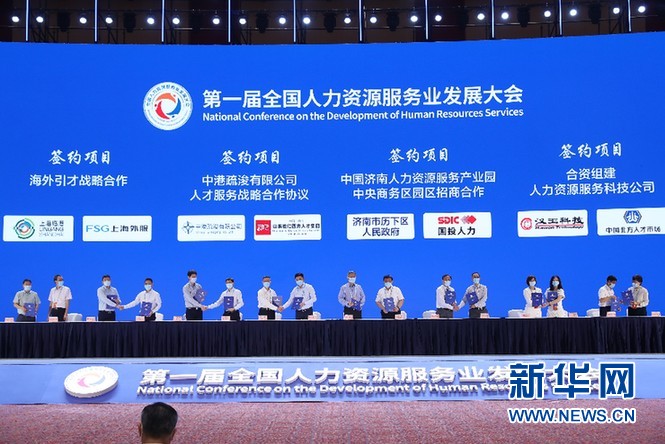 第一屆全國人力資源服務業(yè)發(fā)展大會簽約儀式。新華網(wǎng)發(fā)(重慶市人力社保局供圖)